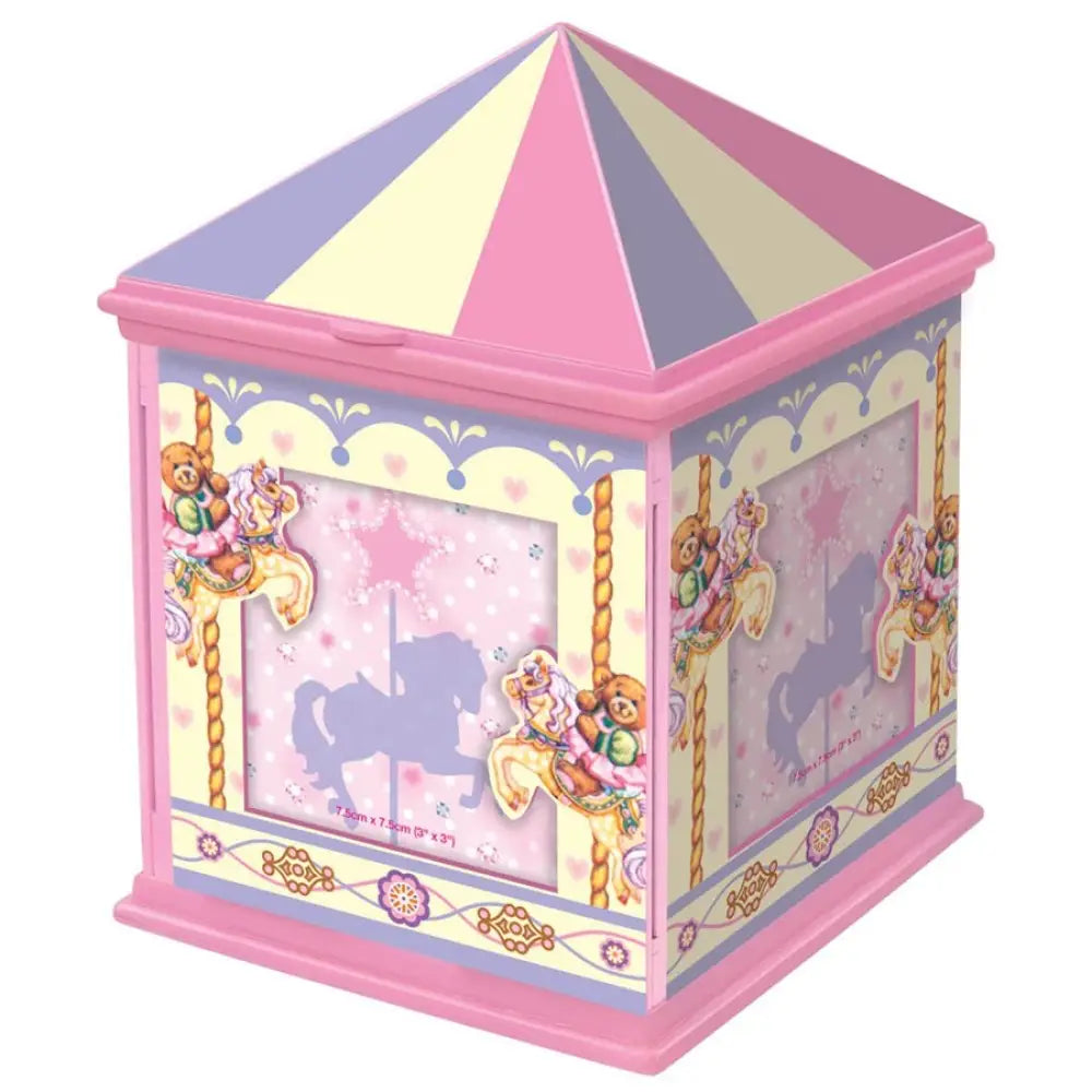 Esta bonita cx de música, foi projetada em carrossel. Ao abrir o teto aparece uma estrela mágica rosa. À sua frente apresenta-se um pequeno compartimento para aneis. Ao levantar este compartimento, aparecerá um grande compartimento secreto, onde tem muito espaço para os seus pequenos tesouros. Os lados da caixa são impressos com motivos coloridos de carrossel a cavalo. Além disso pode também inserir as suas próprias fotos, nas partes externas da caixa. Quando abre a caixa soa a melodia Entertainer.